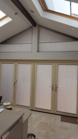 These Pleated Blinds were fitted recently to this large Apex Window with Bi-Folding Doors underneath. Pleated Blinds are an ideal solution for Angled Windows as they can be fully retracted to expose the glass completely when not in use.They are also a great solution for bi-folding/ concertina doors as they can be fitted neatly into the recess of each panel of glass panel.