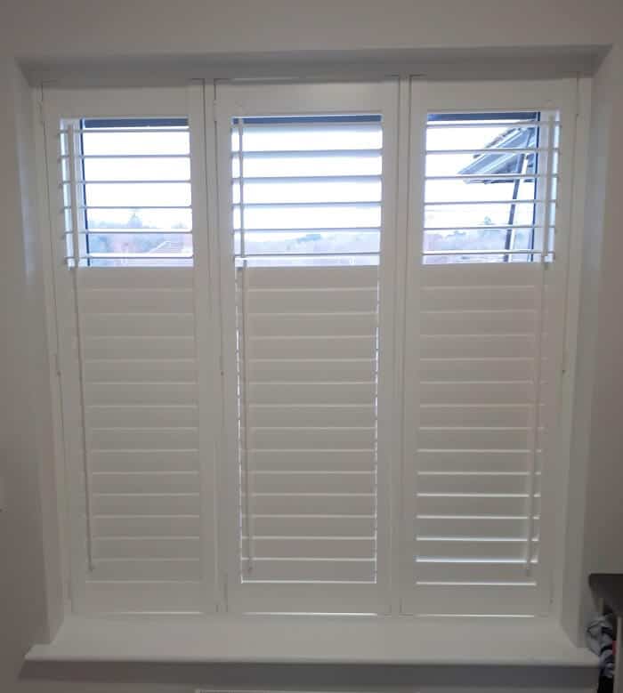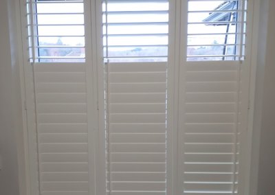 Beautiful 89mm louvre shutters fitted in Lucan, Dublin 20. These silk white shutters come with an offset tilt rod. There is also a mid-rail which divides some of the shutters. There is also an option of a split tilt. This split tilt is used to split the shutter into parts which can be opened independently of each other. Shutters look very well on big windows as you can see. They are great for bay windows as they tend to highlight the shape and size of the bay window from both inside and out.