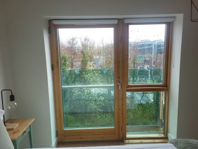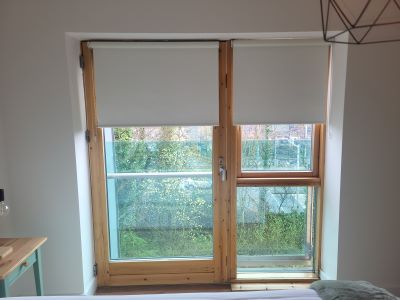 Enhance your pine balcony doors with sleek roller blinds. The perfect simple solution to add privacy without hiding your beautiful woodwork.