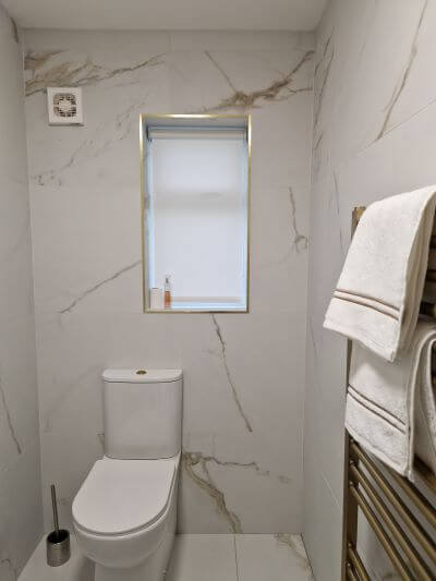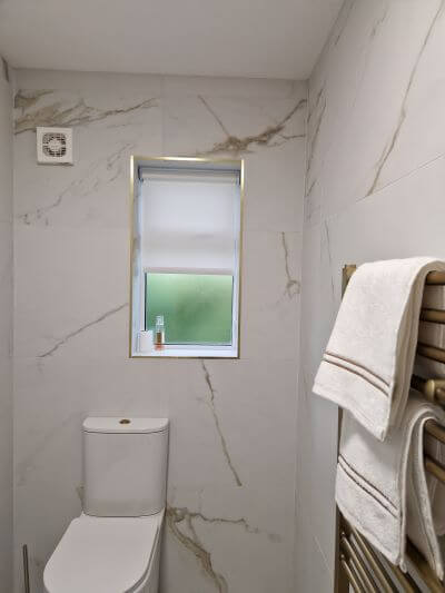 Elevate your bathroom design. See how our bespoke roller blinds perfectly complement gold fixtures and create a stylish, private retreat.