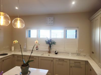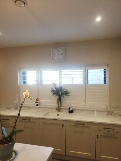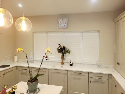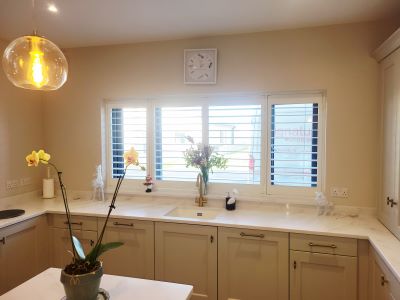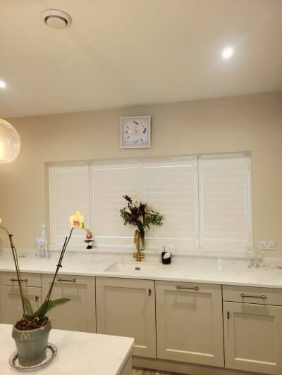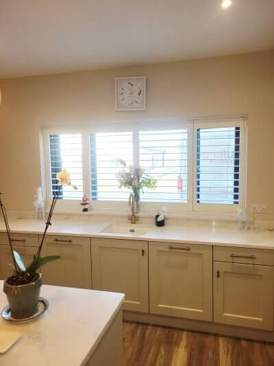 We are the only company to provide such a wide variety of different colours and different types of wood, ensuring a perfect match every time. Our in house team will guide you through our extensive range of colours and shutters to perfectly complement your home. For this customer, the soft white L-frame shutters with easy-tilt were chosen specifically to tie into her kitchen’s existing colour scheme. The result was stunning, the crisp white of the shutters perfectly highlighted both the kitchen cabinetry and the elegant accents of the gold taps and golden handles.