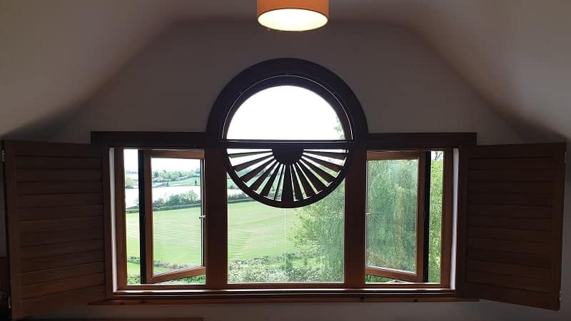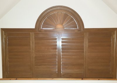 Brown Plantation Shutters fitted in Carrickmacross, Monaghan. These shutters come with a hidden tilt option which allows you to open and close the louvres by just pushing or pulling one louvre. These shutters are made from natural wood and are stained in rich walnut colour. These are very easy to use and very light. The Sunburst shape at the top makes the window stand out and is really a spectacular piece which really adds character to the overall look of the house.