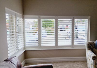 L-Shape Bay Window Plantation Shutter installed in South Wicklow. We enjoy fitting shutters on bay windows because of the end products. The shutters looks aesthetically well from the inside and from the outside. The corner posts are matched up perfectly which means greater light distribution throughout the whole room. The shutters are very practical too and will give you all the privacy you could ask for.