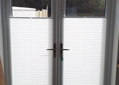 Pleated blinds installed along with a venetian blind in the bathroom in Arklow County Wicklow. The pleated blinds once again feature on doors. They are a very popular option for doors because of the many advantages they come with. The multi friction operated pleated blinds can be closed from the top or bottom and you can even have just the middle covered by the blind and the top and bottom opened. These are great for covering doors and windows and are very popular in large areas such as conservatories and kitchens where you have a lot of exposure to sunlight. The venetian blind is made from a fauxwood which has the ability to resist moisture a lot better than wood. The advantage of this material over wood is that it does not warp in wet conditions and tends to last longer in wet conditions than wood.