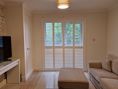It’s an age old challenge for Dublin homeowners, how do you dress a large patio door to keep the biting Irish cold out while seamlessly matching your beautiful interior colour scheme? We all know that sliding doors can be a weak point for heat loss making the surrounding room feel draughty and uninviting especially during the winter months. Thankfully, we’ve found the perfect answer for this common issue—a sophisticated and highly effective solution that immediately adds a feeling of comfort and luxury. Pure white, 76mm louvre, Crown Z Frame shutters not only offer superior insulation against the cold but their crisp, timeless look integrates effortlessly with any home décor, transforming that cold glass barrier into a stunning feature wall.