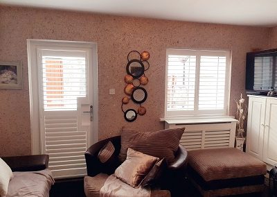Plantation Shutters installed in Whitestown, Dublin 15. These shutters come with an L-type frame which is fitted in the recess of the window. There is a French door cut-out on the back doors which allows you to open and close the back doors with the shutter as the same time. Cut-out for the handle makes in very convenient and practical for you to open and close the back doors. Hidden tilt option allows you to open and close the louvers very easily.
