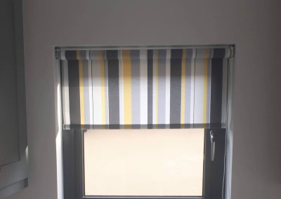 Roller blinds installed in Dundrum, Co Dublin. Screen roller blinds are great for kitchen areas because they are great for giving you privacy while still letting some light in so you can have natural light. There is one colourful roller blind which adds a bit of flavour and character to the house. These blinds are very practical and durable.