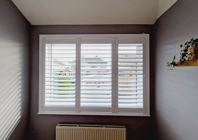 Shutters throughout a house in Portmarnock. White Shutters Dublin. Our shutters will help you eliminate the noise coming from the outside. They will also help you retain heat inside your home. Whether its small and large bedrooms or open living spaces. Shutters will are a very practical option for each and every window. The low maintenance of shutters is also an appealing factor for our customers.