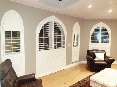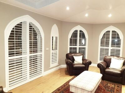 If you’ve been wondering what kind of blinds or curtains could ever fit an arched or angled frame, the definitive answer is look no further than custom shutters.