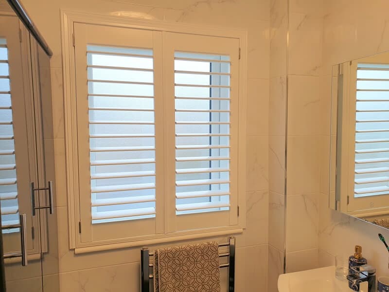 White Plantation Shutters fitted in Swords, Dublin. In these pictures you can see 3 different types of materials. The Shutter in the bathroom is made from PVC which works great in wet conditions, unlike Wood and MDF it will not warp when wet.  Large shutter on back doors is made from Wood which is lighter than MDF and therefore it can be easier to maintain on larger windows. MDF type of shutters are installed on the other 2 windows which are quiet small in size. All Materials come with 5 year warranty and all will look the same.